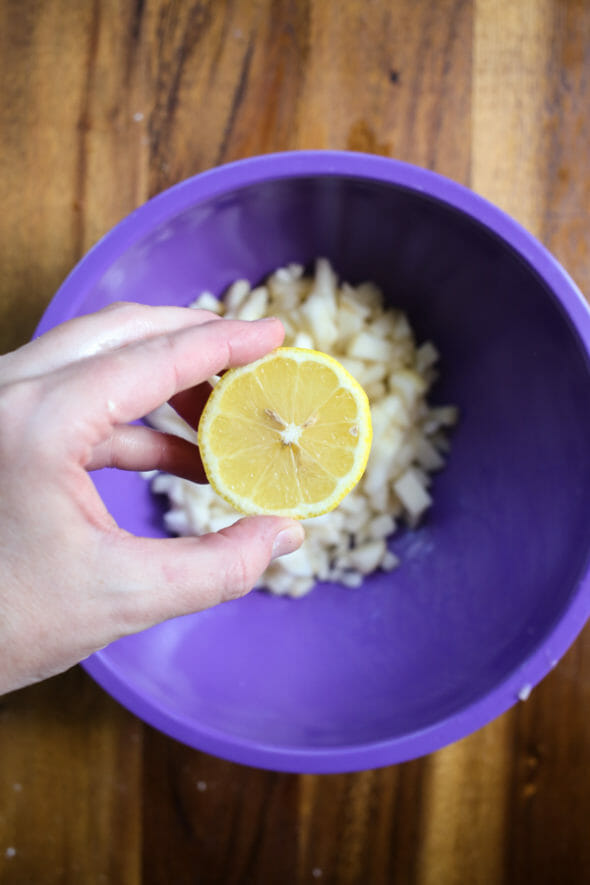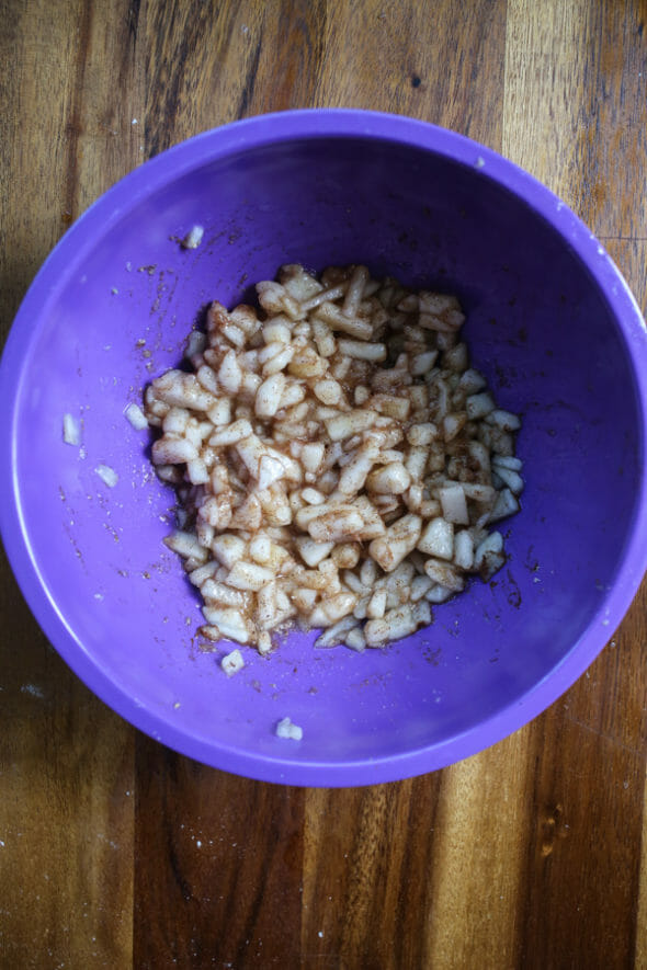 - In a bowl, combine diced pears, lemon juice, spices, and salt.
