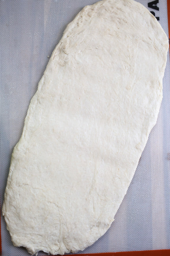 - Roll chilled dough into a 6×18″ rectangle on a greased surface.