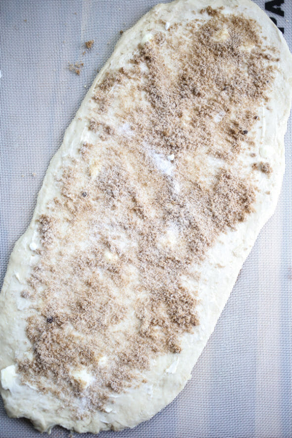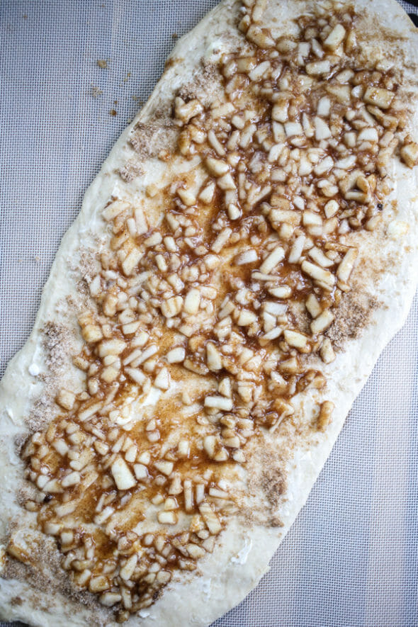 - In a small bowl, mix the melted butter, white sugar, and brown sugar. Spread the butter mixture over the dough and then top with the pear mixture. Roll up tightly, making a log about 18″ long. With a very sharp knife or dental floss, trim off about 2 inches on either side.