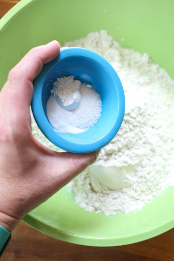 - Mix remaining ½ cup of flour with baking soda, baking powder, and salt. Sprinkle over the dough and then mix it in with the wooden spoon. Place a sheet of plastic wrap over the pan and refrigerate for at least a few hours and up to a few days. You can also allow it to rise at room temperature for about an hour if you want to make these right away.