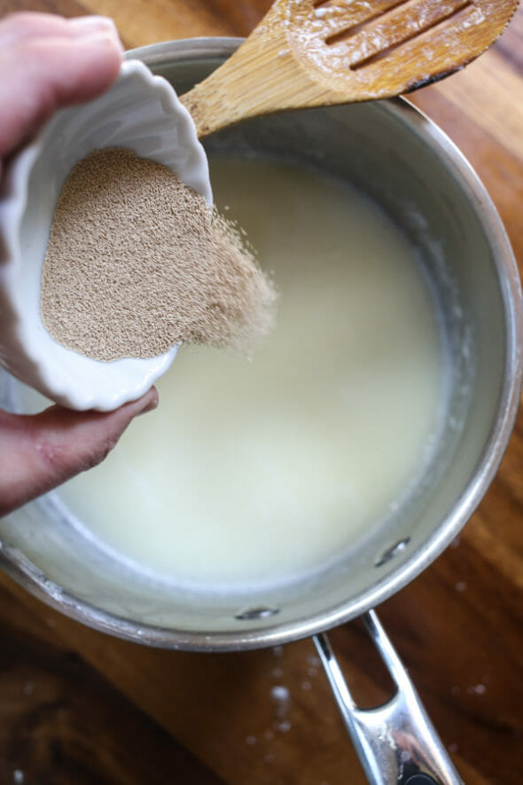- Sprinkle yeast over the milk mixture, let sit 10 minutes, then stir.