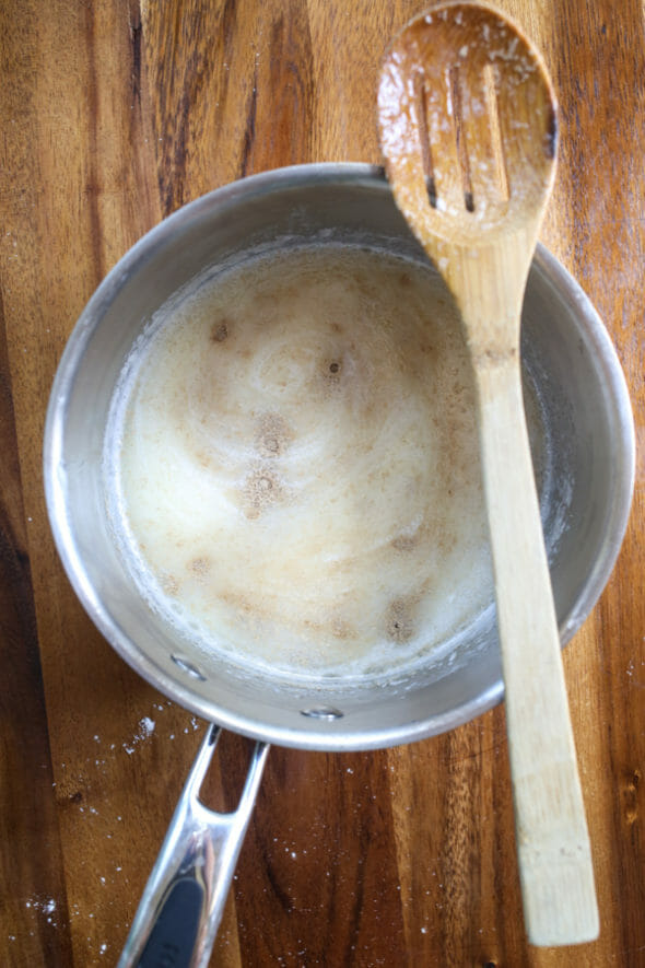 - Heat the stick of butter in a small saucepan over medium heat, stirring very frequently. When the butter melts, stir constantly. The butter will get clear and yellow and then very suddenly become frothy, turn brown, and smell like caramel. When this happens, remove from heat. Don't walk away, things can go south very quickly.