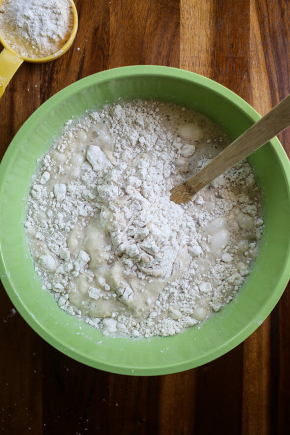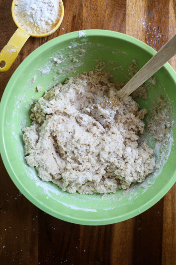 - Mix remaining ½ cup flour with baking soda, baking powder, and salt; stir into dough.