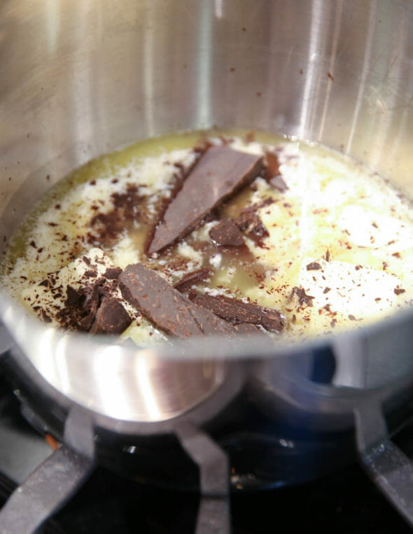 - Melt butter, 2 oz. chocolate, and water in a saucepan.