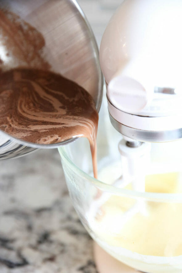 - In a large bowl, mix sugar, buttermilk, eggs, and vanilla. Slowly add chocolate mixture, then gradually mix in flour.