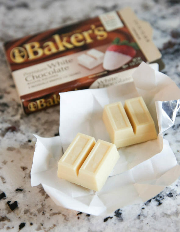 I used white baking chocolate (which you can find in the baking aisle of the grocery store) but you could use white chocolate chips, too. Note that chips don’t quite melt as easily though.