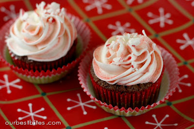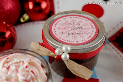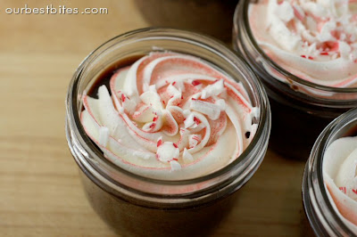 Use this frosting recipe, adding peppermint extract (in addition to the vanilla extract called for) at the end by 1/4 tsp to taste. I prefer at least 1/2 tsp. See instructions in the above post for creating a red and white striped look. Pipe frosting on each jar, being careful to leave room for the lid. If desired, sprinkle on some crushed candycanes and then screw on jar lids.