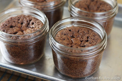 Place the mason jars on a cookie sheet. Divide the mixture evenly among the 8 jars (no need for greasing the jars) or 12 cupcake liners if you’re going that route. The jars should be about half full or a little less. Bake until a toothpick inserted into the center of the jar comes out with only a few moist crumbs attached 22-25 minutes. Remove from oven and carefully (with a pot-holder!) transfer jars to a cooling rack. Let jars cool till at least close to room temperature before topping with ganache.