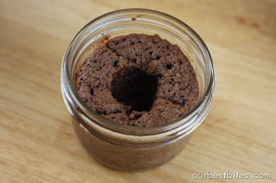 To assemble, pour 1 1/2-2 Tbs ganache over the top of each cupcake jar. If desired, use a paring knife to first hollow out a well in the middle of the cake. Tilt jars to distribute ganache evenly over the top of the cake and then let cool for the ganache to set. If storing overnight, place lids and rings on jars and leave at room temperature.