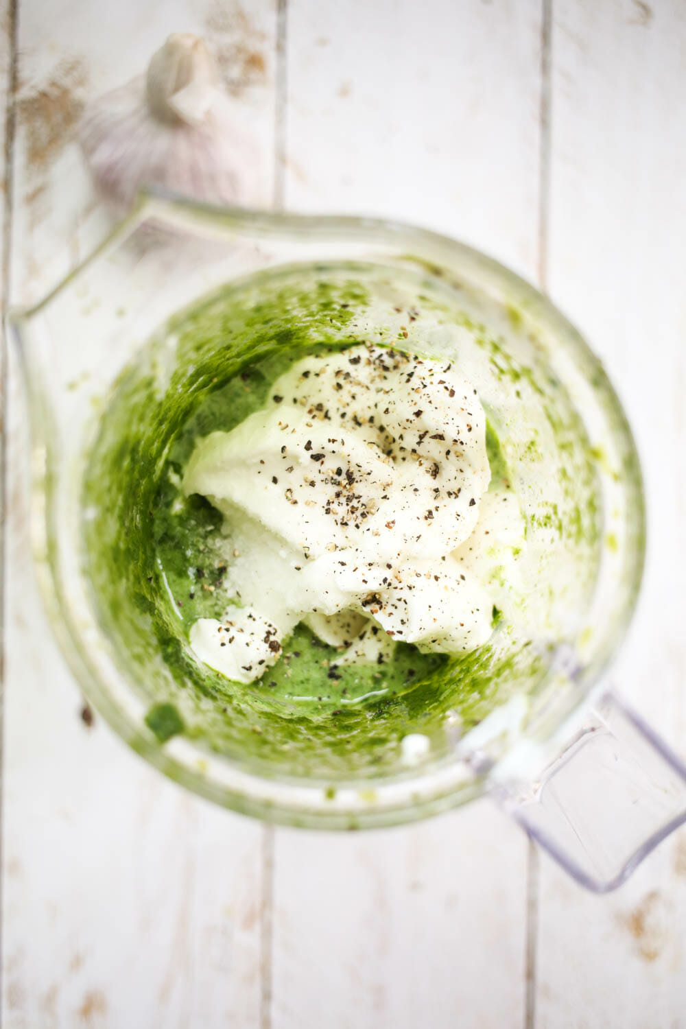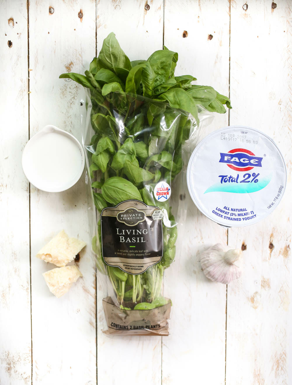 You’ll need garlic, lots of fresh basil, kosher salt, freshly ground black pepper, whole buttermilk, 2% Greek yogurt, and parmesan cheese.