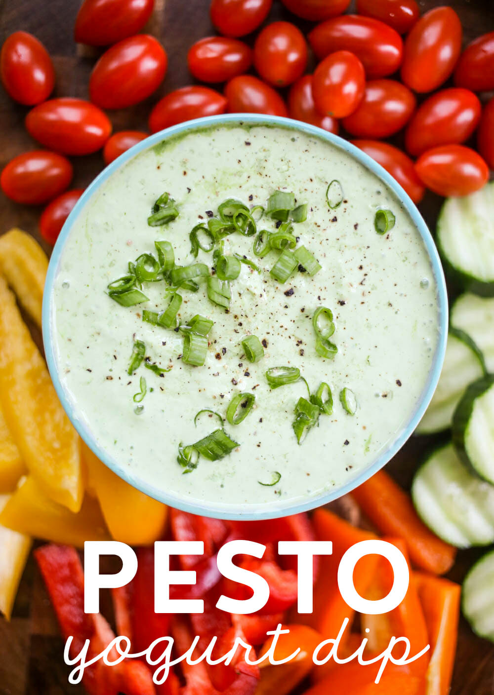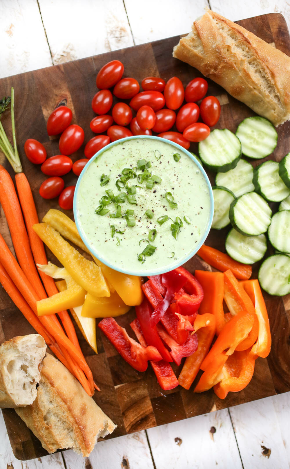 Veggie platters are one of my favorite snacks (and one of my favorite ways to survive late summer.) But I get kind of tired of the typical ranch or dill dips, so I was excited to see this Pesto dip in this month’s Cooking Light. It’s super easy and flavorful and a great way to use up all that basil in your garden (and I say your garden, because, if you don’t know, I kill plants. It’s one of my gifts.) Plus it gets better with time, so you can make this a day or two in advance and it only gets more delicious.