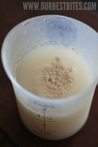 and allow to stand for 10 minutes and the mixture is frothy. Word to the wise: if it still looks like this after 10 minutes, try again. Which is what I had to do. Better to re-do the yeast-proofing than to think/say naughty words an hour later when your dough doesn’t rise.