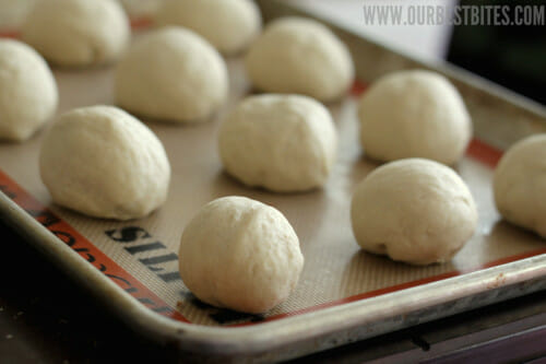 - When the dough has risen, turn it onto a surface lightly sprayed with non-stick cooking spray. Divide into 12 equal pieces or use a scale to measure out 3-ounce pieces of dough. Shape the dough into balls, place on a lined baking sheet (parchment or a silicone liner), cover, and allow to rise for 30 minutes.