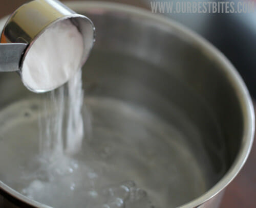 While the dough is rising the second time, preheat the oven to 425. Bring 8 cups of water to a boil in a medium saucepan. When the water begins to boil, add the baking soda