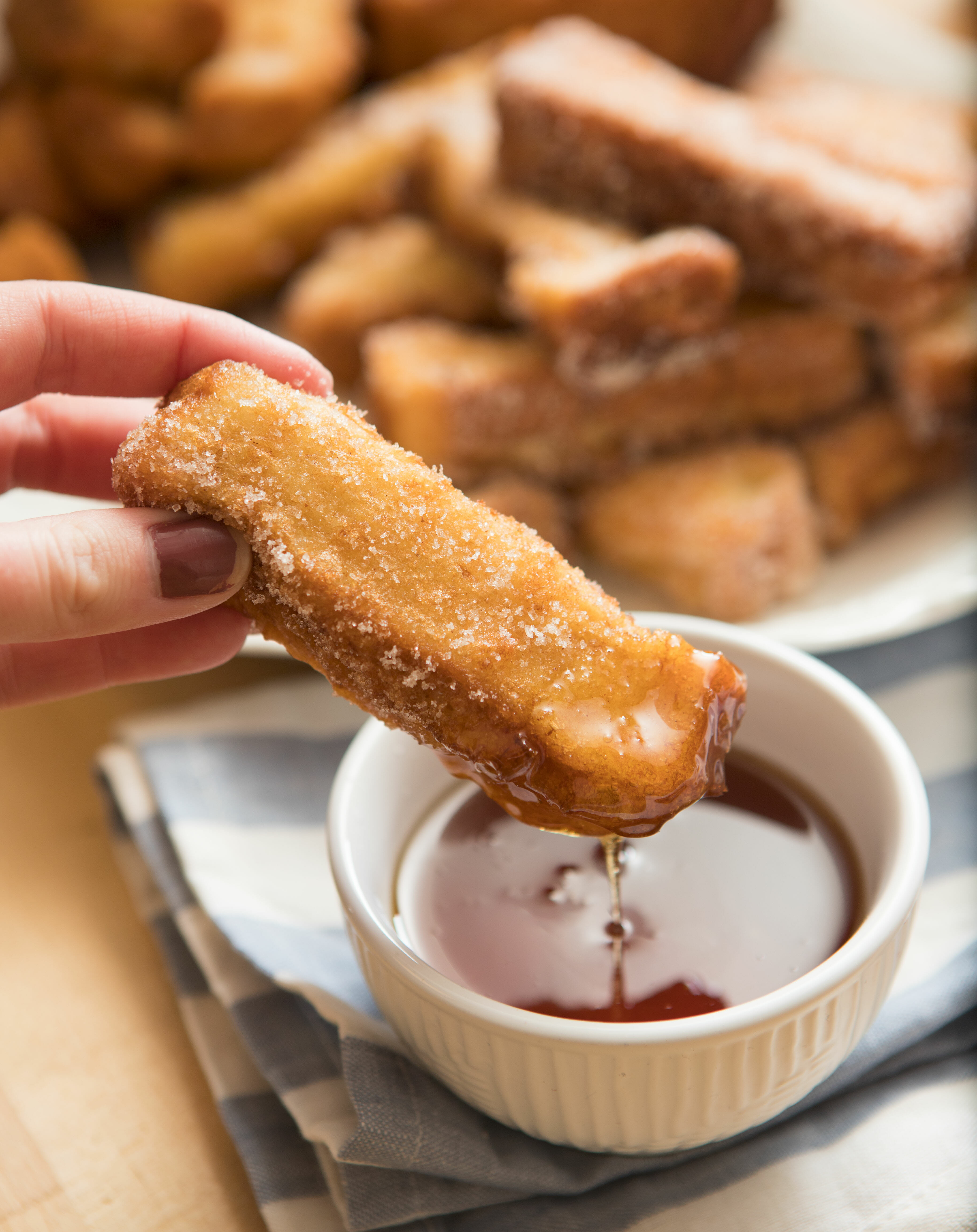 While you’re at it, go ahead and dunk these in some maple syrup, buttermilk syrup, strawberry syrup, spread some honey butter on there.