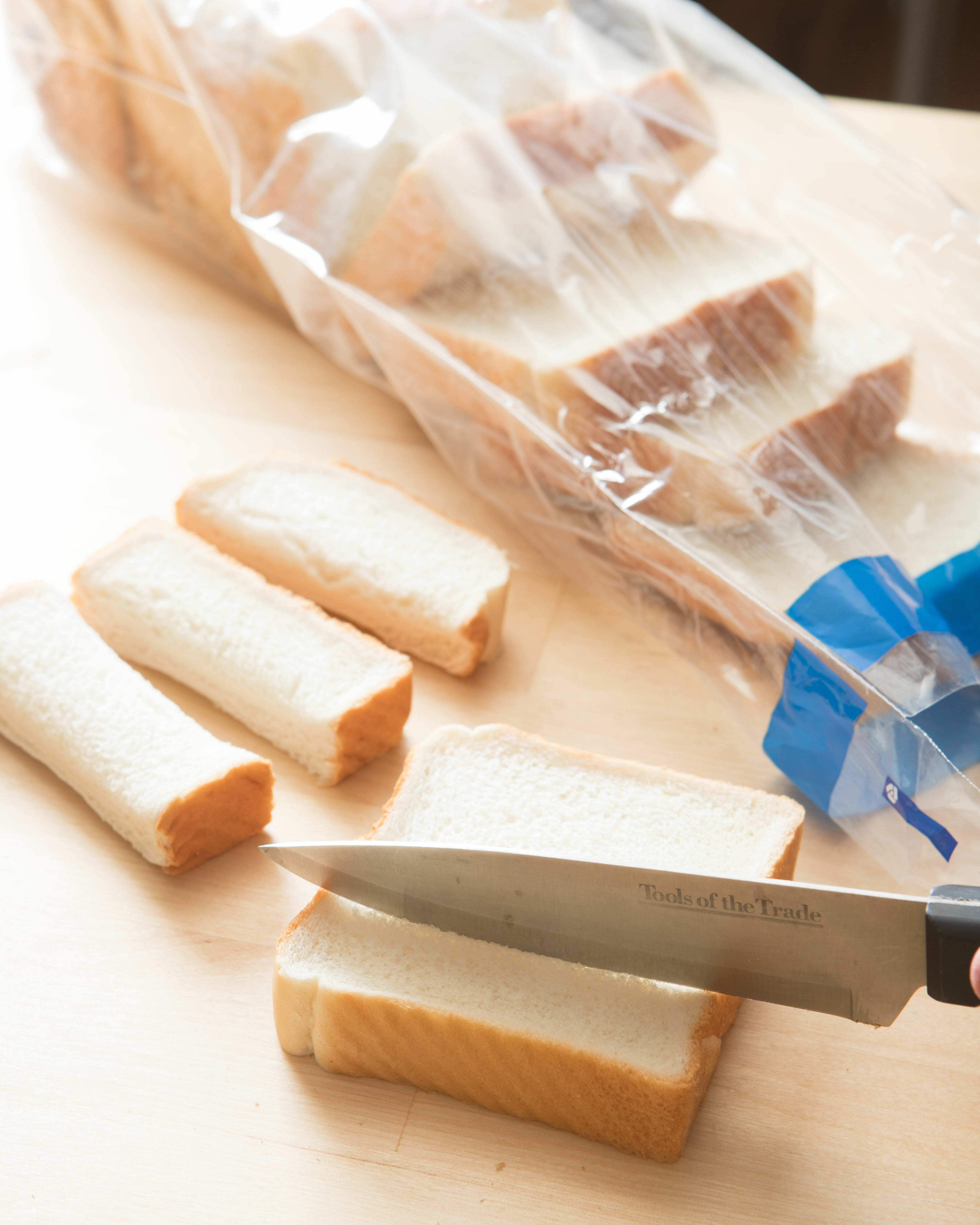 - Cut the bread slices into about 3 strips per slice.