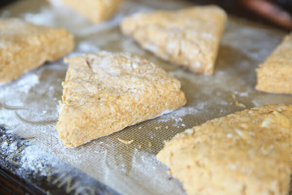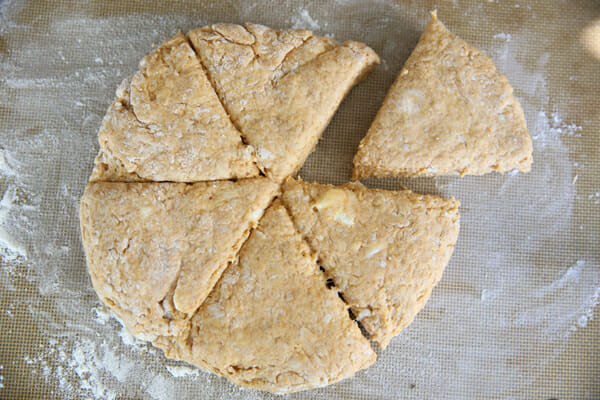 Gently pat the dough into a circle shape, about an inch or so thick. Use a pizza cutter to divide it into wedges. One thing I always do with scones, that I didn’t do here because I was distracted by picture taking, is to take a little of your cream and brush it over the top, then sprinkle with sugar (coarse sugar if you have it) before cutting them. It gives them a beautiful, sparkly sweet crust.
