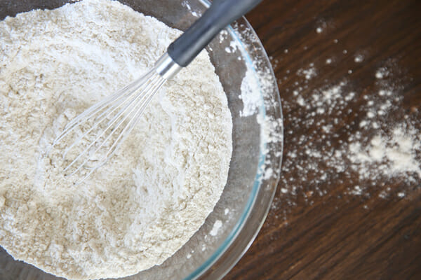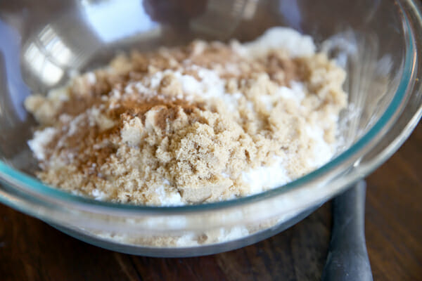 Start by mixing up some quick dry ingredients. We have flour, baking powder, brown sugar, some spices, and a little salt.