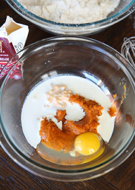 Next you’ll whisk together your wet ingredients: pumpkin puree, vanilla, cream, and an egg.