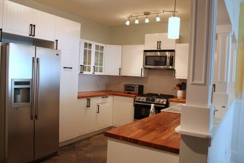 A. I love Ikea kitchens and I love that we saved a lot of money (but got great-looking cabinets) by doing a lot of it ourselves. They’re good quality and they have a 25-year warranty, so there’s not much to worry about in terms of them not holding up over the years. That said, we are 4 hours away from the closest Ikea and I wouldn’t do another Ikea kitchen being so far away, especially with little kids.