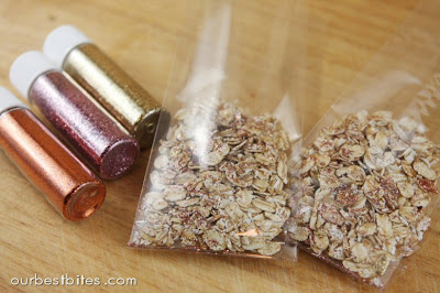 So fun! We started doing this last year with glitter, and this year it was colored sugar- I gave each girl an old spice jar with a bit of sugar in it, and we put a drop or two of food coloring in and they shook it like mad, then dumped in some oats. They shake their jars a few times a day, they're pretty excited to dump them out tomorrow!!