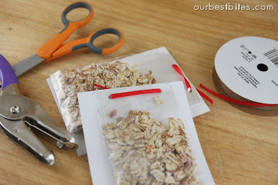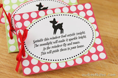 Just put your reindeer food in little baggies (a sandwich bag will do) and punch a hole in the corner and tie on the tag, or do as I did here and punch two little holes and pull the ribbon through