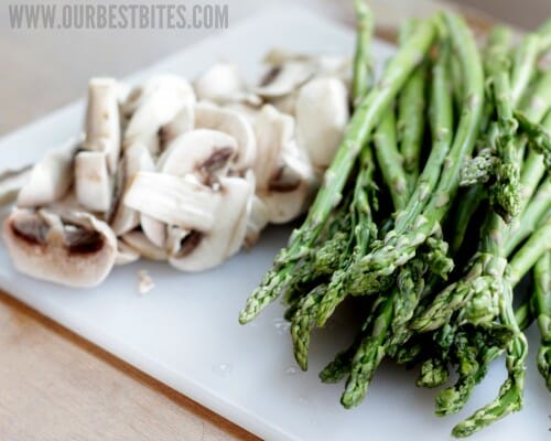 To get started, break the tough ends off of a pound of asparagus and thickly slice about 3-4 cups of whole mushrooms.