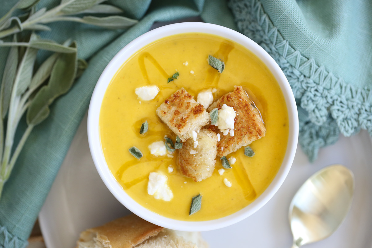 - Ladle soup into bowls and top with a few croutons and a drizzle of honey. Extra delicious with a sprinkle of chopped fresh sage, additional feta, and a little drizzle of chili crisp!