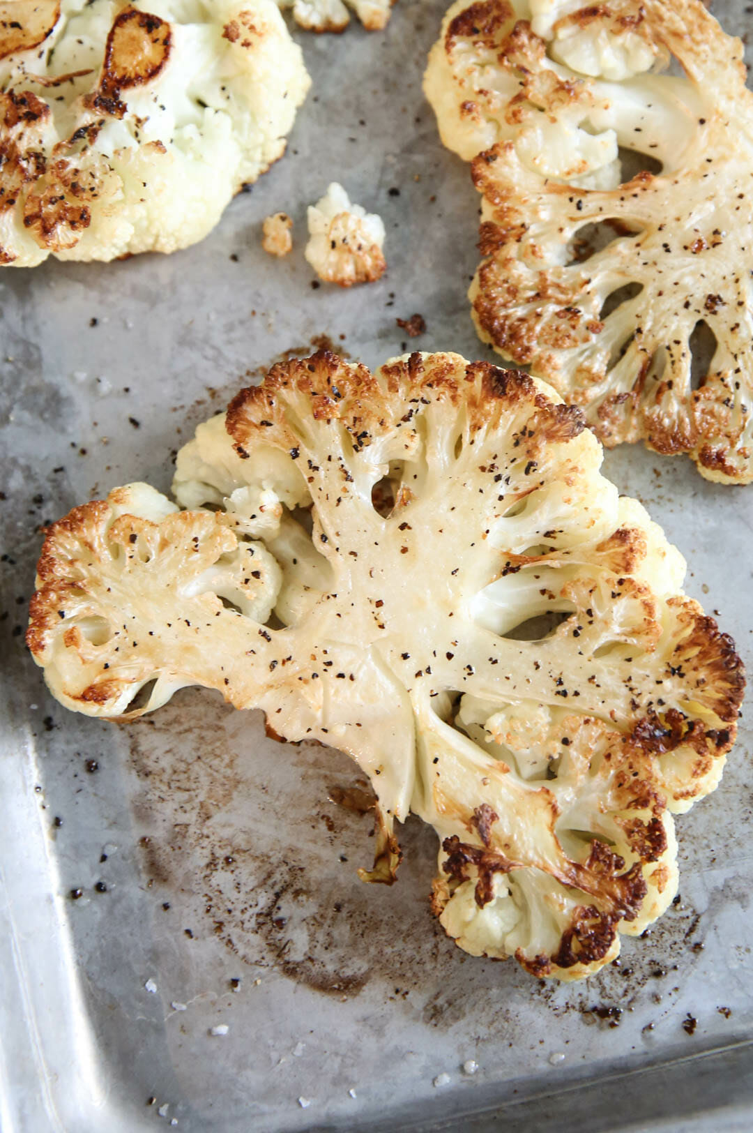 - Brush each cauliflower steak with olive oil and sprinkle with salt and pepper. Carefully remove hot baking sheet from oven. Place cauliflower oil-side-down on the pan. Lightly brush the remaining sides with oil and sprinkle with salt and pepper and return pan to oven.