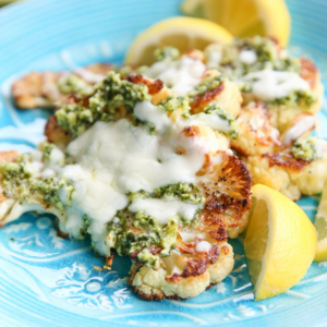 Roasted Cauliflower Steaks with Pesto and Mozarella
