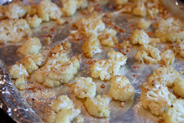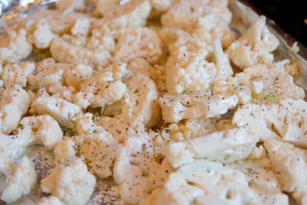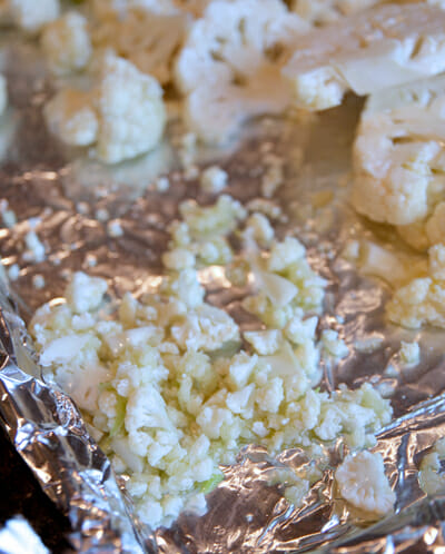 You’ll notice when you toss it all together that you’ll have little bits all over. It’s crumbled pieces of cauliflower and garlic and it’s the best part after it’s cooked! Scoop all of those up and sprinkle them on top of everything else before you put your pan in the oven.