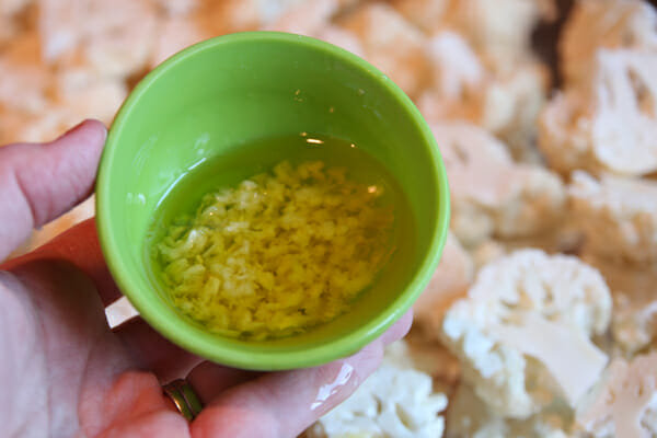 Just toss it all on a foil lined baking sheet so it’s in a single layer. You want all of the pieces to have contact with the pan so they can brown and caramelize. Next, drizzle on fresh minced garlic and extra virgin olive oil. A little trick you’ll see in the instructions is that I heat the oil and garlic in the microwave just to warm it. That infuses the oil with the garlic flavor, therefore better flavoring your veggies.