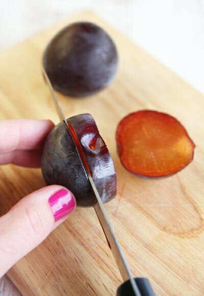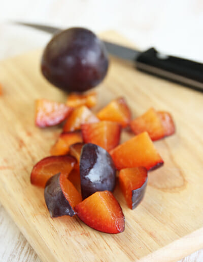 The first thing you’ll need to do is dice the plums up. Plums can be a little tricky to pit because they often don’t pull off the seed like other stone fruits do. If your plums are small and soft, you might find it easiest to cut it like you would a mango, like I did. Just slice right down next to the pit and you’ll get 2 large halves, then you can cut off the sides of the pit.