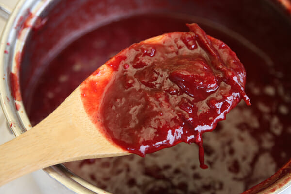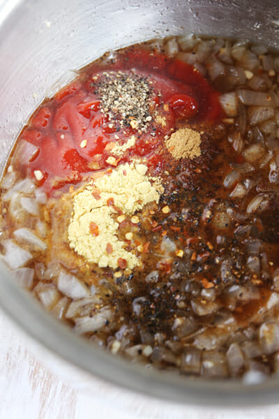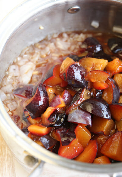 Stone fruits lend really well to sweet-savory sauces like this one. We’ll start with a base of sauteed onions and garlic and then add a little ketchup, soy sauce, ginger, mustard, red pepper flakes, brown sugar, and a hint of cloves.