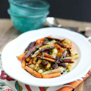 Easter is literally right around the corner, and as you’re planning your delicious menus for this spring holiday, here’s an easy and elegant side dish– roasted rainbow carrots with a delicious balsamic glaze! These carrots are so simple. I feel like side dishes on holidays should be easy because there’s so much going on. But these are so elegant looking when they’re done, that no one needs to know how easy they were to make. These are sweet and tangy and so beautiful and delicious. Make them for Easter and then again for an easy weeknight side dish!