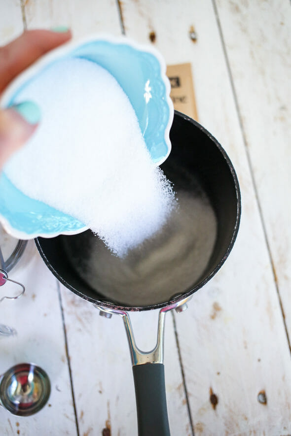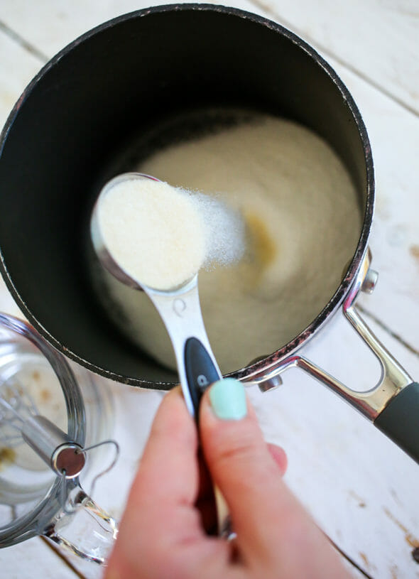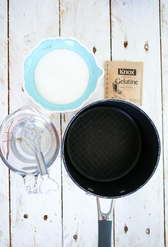 - Whisk together the sugar and gelatin in a small saucepan and whisk in the cold water. Allow to stand for 5 minutes.