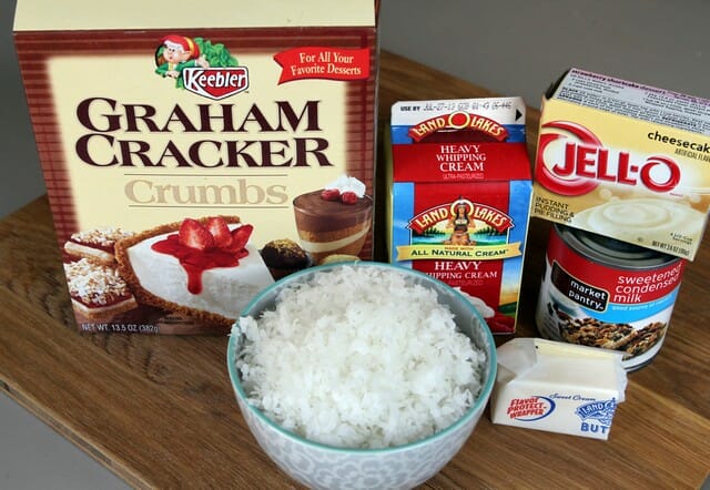 You’re going to need graham cracker crumbs, sugar, melted butter, instant cheesecake-flavored pudding, coconut, coconut extract, sweetened condensed milk, caramel sauce, chocolate sauce.
