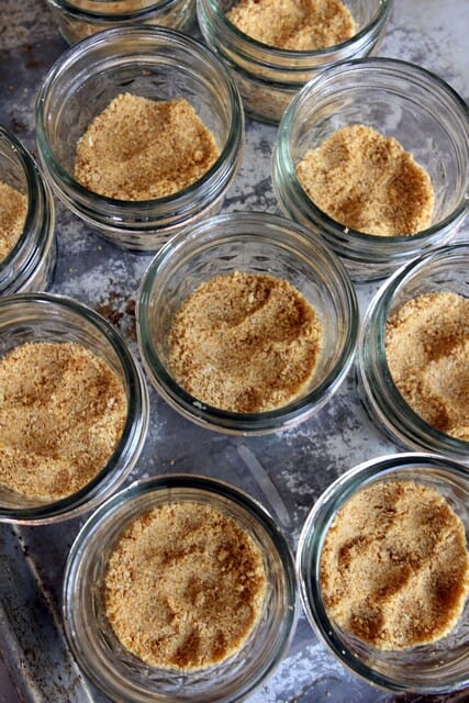 Press 1 tablespoon of the crumb mixture into a 4-ounce jars, mugs, ramekins, or other container*. Repeat with 11 more jars. Set aside.
