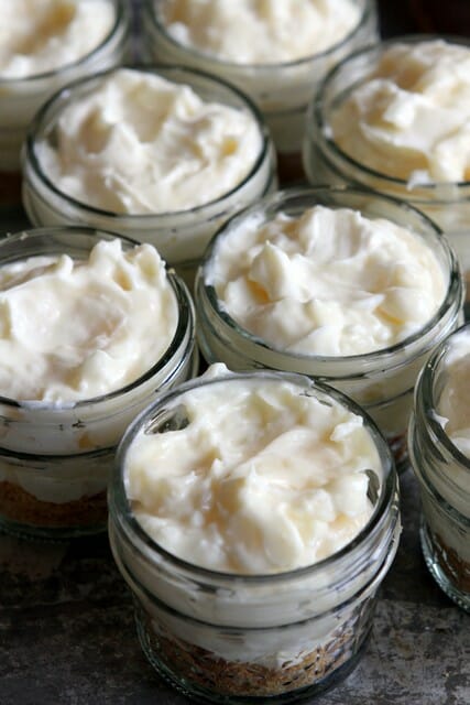 In a small mixing bowl, combine the graham cracker crumbs, sugar, and melted butter. Press 1 tablespoon of the crumb mixture into a 4-ounce jars, mugs, ramekins, or other container*. Repeat with 11 more jars. Set aside.