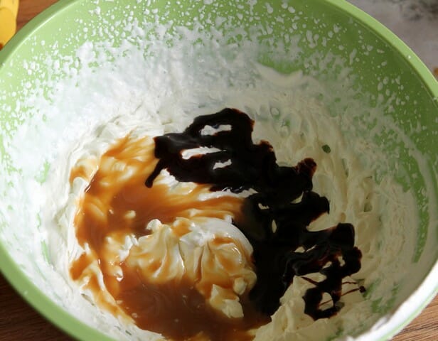 Whip the remaining 1 cup of cream until ALMOST stiff peaks form. Drizzle half of the mixture with caramel sauce and the other half with chocolate sauce.