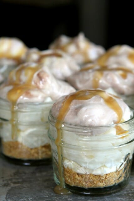 If you want to make these ahead of time, prepare the pies through the step where you spoon the filling into the jars and then drizzle with caramel and make the whipped cream topping right before serving. Makes 12 mini pies or 2 full-size pies.