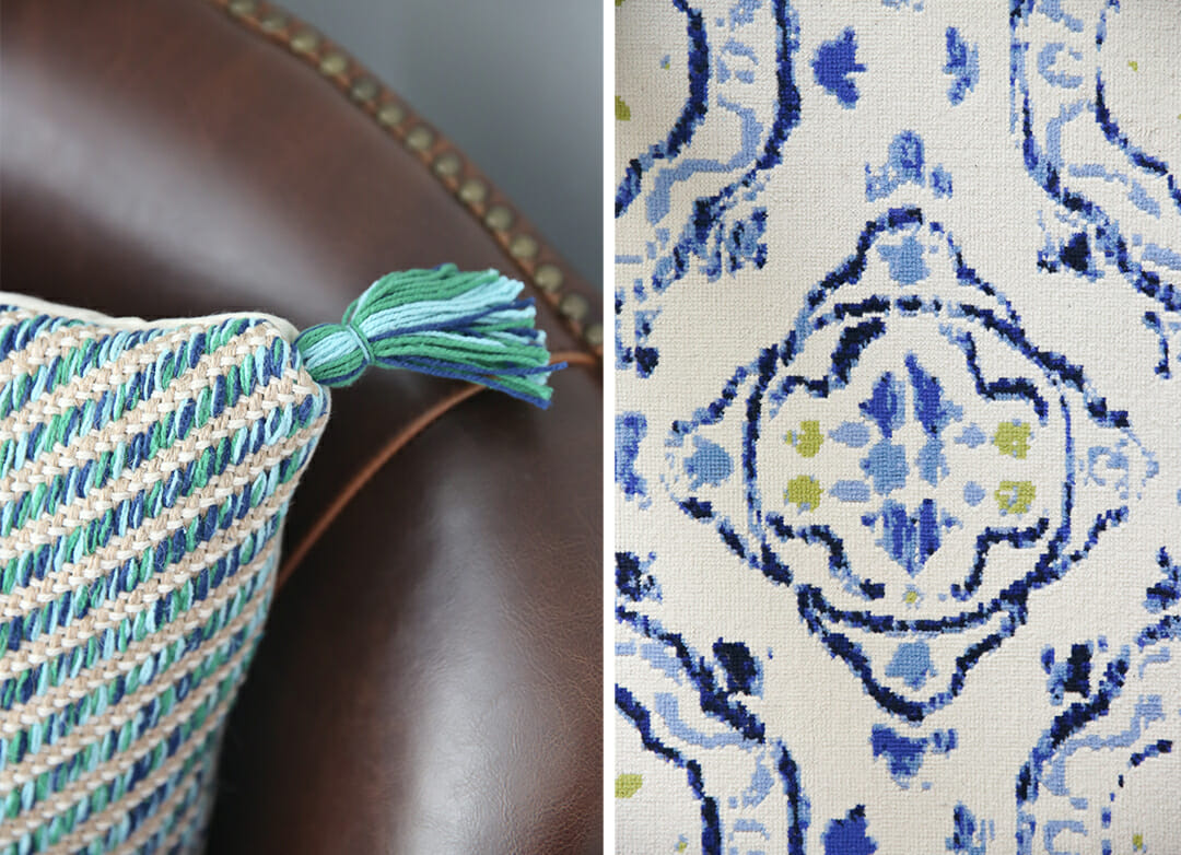 When it comes to design of the room, I had a few pieces of inspiration. First was this pillow and the rug. The rug is actually from the outdoor section of Target (only $60!) I’ve found that outdoor rugs work really well in some indoor spaces. They’re not plush, so you can still roll chairs over them and they’re super durable and washable. I wanted shades of blue and green, from light aqua to navy and pops of color like that chartreuse.