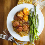 If you used a baking sheet, transfer 2 tablespoons of the bacon drippings to a frying pan. If you used a cast iron pan, drain all but about 2 tablespoons of bacon drippings and return the pan to the stove. Heat the drippings over medium heat. When hot, add the sliced onions and kielbasa. Cook for 10-15 minutes, stirring frequently, until the onions are caramelized and the sausage is crisping up on the edges. Transfer the onions, sausage, crumbled bacon, and sauerkraut mixture to a slow cooker and cook on high for 2-3 hours or on low for 4-6 hours. Serve with German potato salad or roasted potatoes.