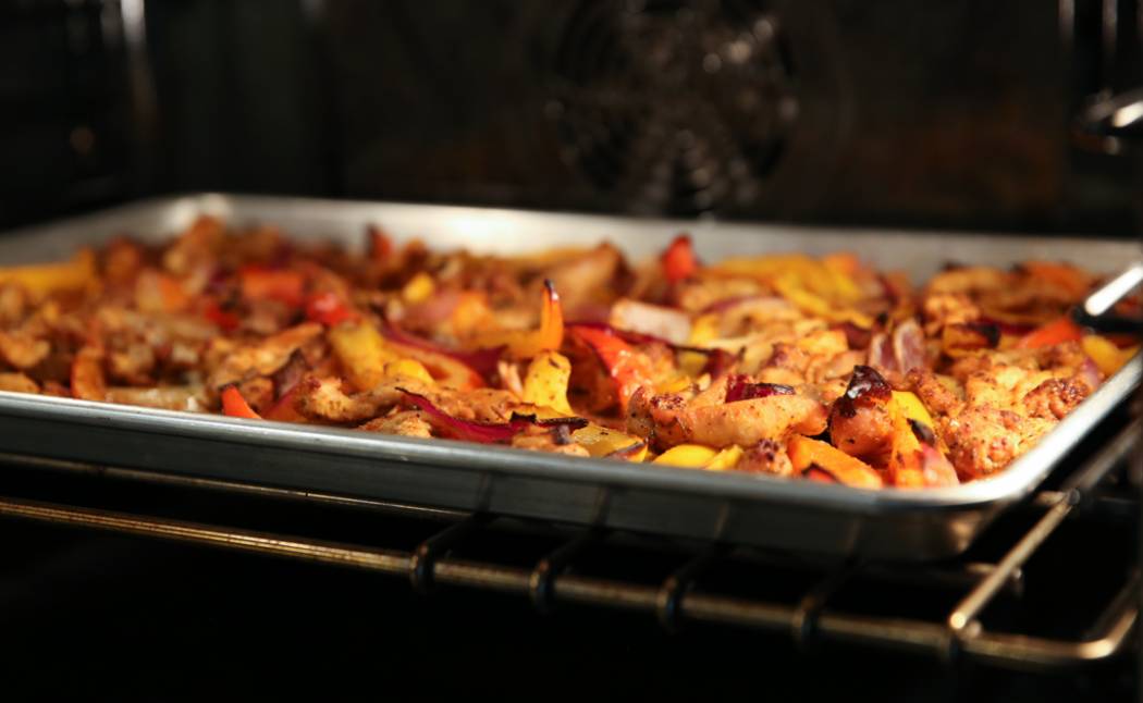 - Spread chicken and pepper mixture out evenly on baking sheet and place in oven. Bake for 20-30 minutes (closer to 20 with convection) until chicken is cooked through and vegetables are tender. If desired, place under broiler for a quick minute to brown.