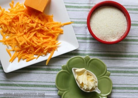 If your shrimp are already peeled and deveined, you can get started on the grits (otherwise, peel and devein the shrimp first). Grits kind of get a bad rap, but I think if you make them and serve them right, they’re delicious. Like, for instance, with butter and lots and lots of cheese: