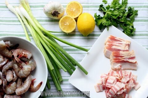 You’ll need 6 ounces of regular bacon, cut into bite-sized pieces, some green onions, fresh parsley, fresh lemon juice, fresh garlic. How can you possibly go wrong with those ingredients?