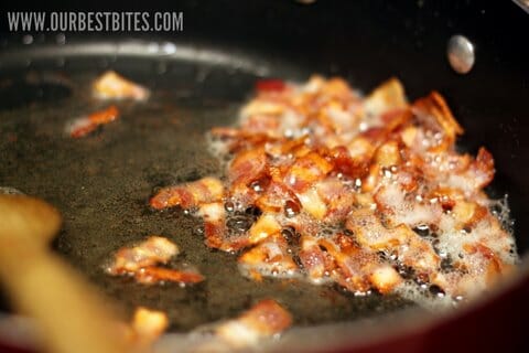Using a slotted spoon, remove the cooked bacon from the pan and let it drain on a paper towel. Reserve the bacon grease. All of it. This recipe is not going into our “Healthy Meals” category.