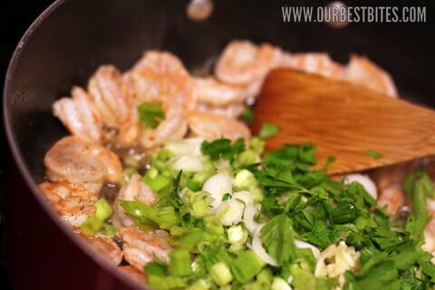 When the shrimp are barely turning pink, add the green onions, garlic, lemon juice, parsley, and cooked bacon and stir-fry for another 2-3 minutes.