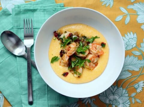 When the grits are done cooking, add the butter and cheese and stir until smooth. Ladle the grits into shallow bowls, top with the shrimp mixture (you can also garnish it with a little extra parsley and green onions), and eat it immediately. It’s so pretty that you’ll want to serve it with the shrimp on top, but when you go to eat it, be sure to mix it all together. Unless you’re my husband, who kept passing off his shrimp to the kids when he thought I wasn’t watching (he’s hopeless).
