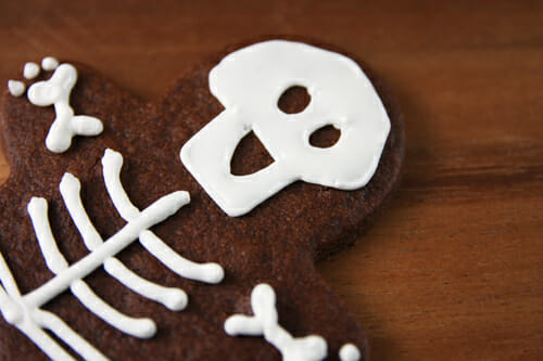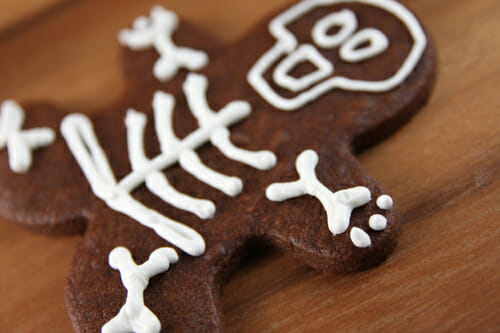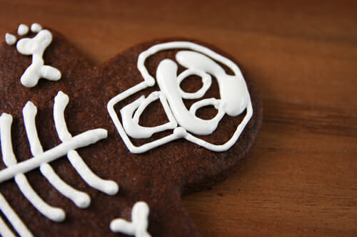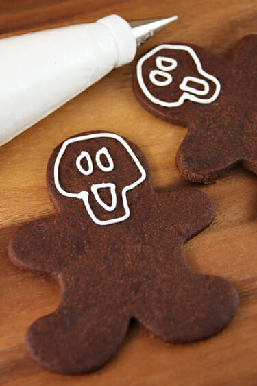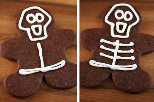 - Cut cookies into gingerbread men shapes. Bake and cool completely. Pipe faces on cookies and then remainder of skeleton design. Add water to royal icing until it resembles a thick syrup. Drizzle onto open space in face design and use a tooth pick to spread it out and into the crevices. Let cookies dry completely, several hours or overnight.